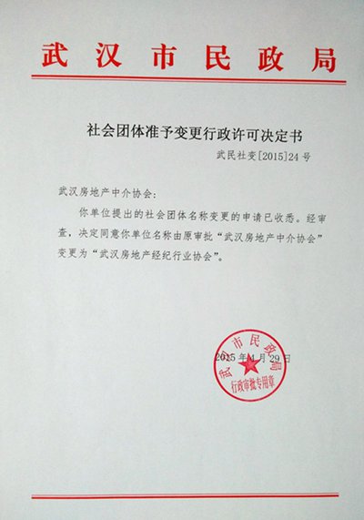 报业务主管部门武汉市房管局批准同意后,我协会按照规定的名称变更流程提出申请,经武汉市民政局核准,2015年4月29日经审查同意变更。变更文件参详:《社会团体准予变更形成许可决定书》(武民社变【2015】24号)