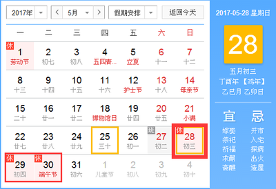 五月二十八日(星期日)至 五月三十日(星期二)放假调休。 五月三十一日(星期三)恢复正常上班。